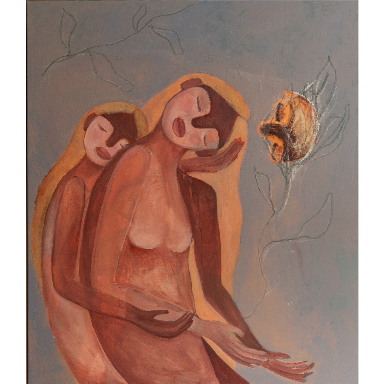 Annemieke Denters (1989) is a figurative artist based in Amsterdam. Her work explores how memory lives in the body – stored not in words, but in posture, rhythm, and relational silence. She paints what is sensed but rarely spoken: leaning figures, closed eyes, gestures repeated and reassembled. Each composition holds space for what lingers – care, absence, and the quiet resonance between people.
