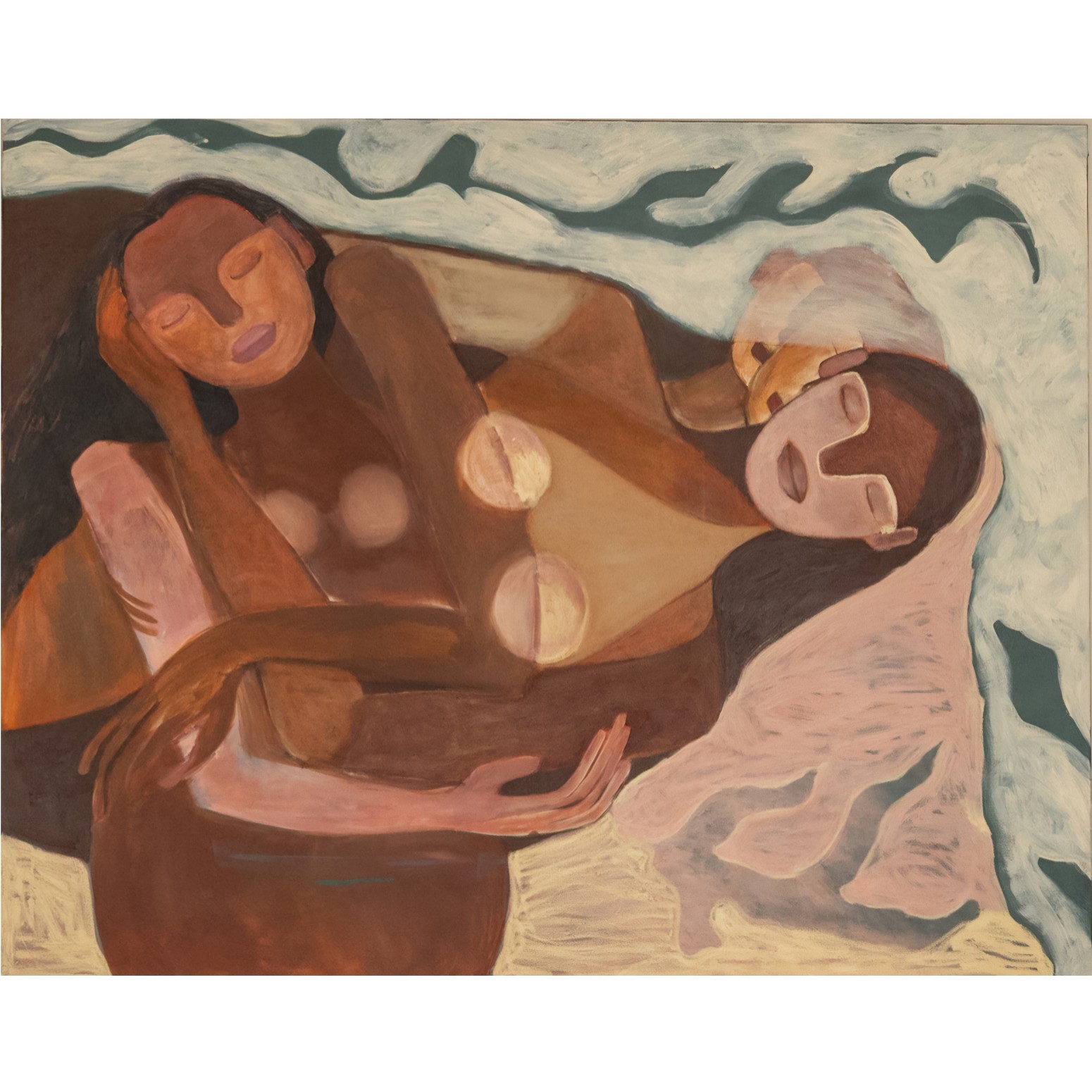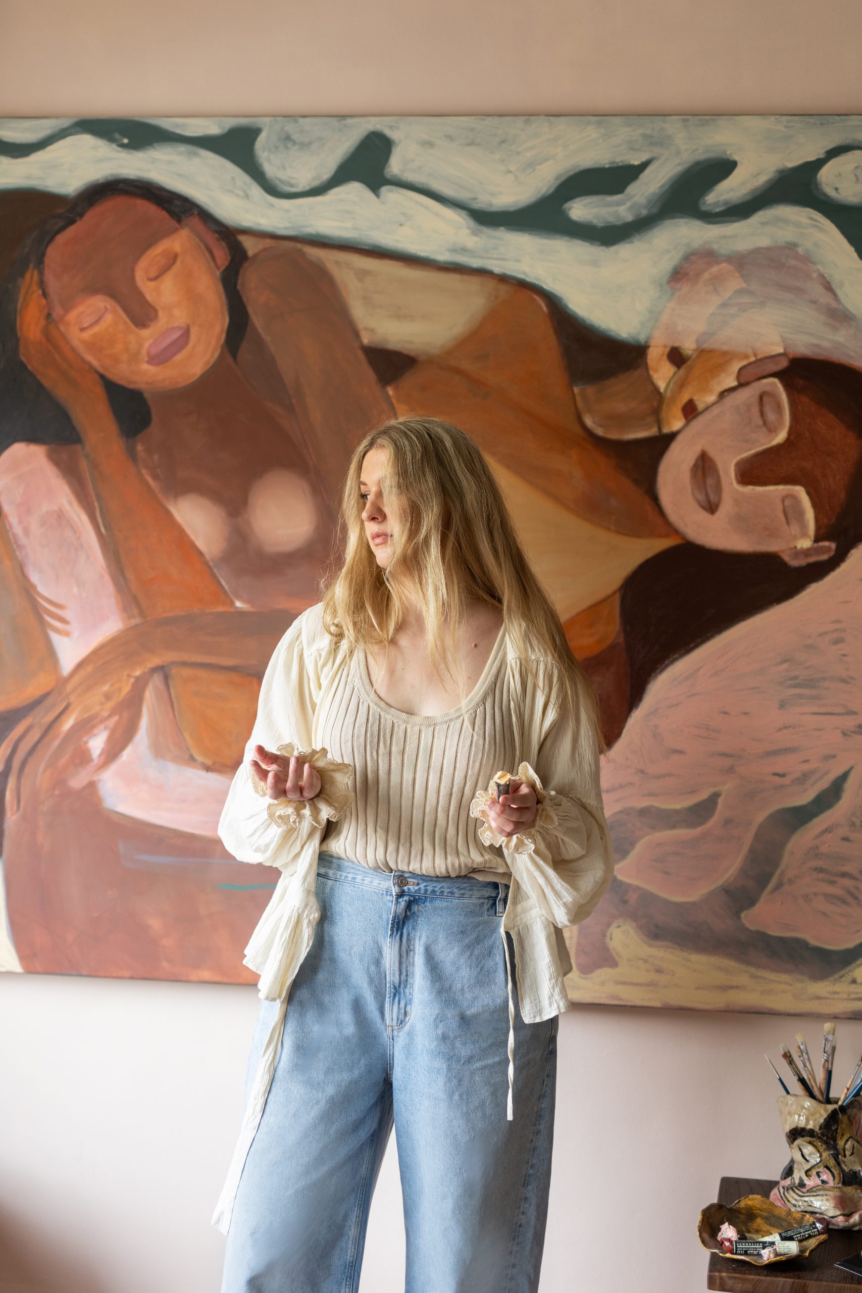 Annemieke Denters (1989) is a figurative artist based in Amsterdam. Her work explores how memory lives in the body – stored not in words, but in posture, rhythm, and relational silence. She paints what is sensed but rarely spoken: leaning figures, closed eyes, gestures repeated and reassembled. Each composition holds space for what lingers – care, absence, and the quiet resonance between people.