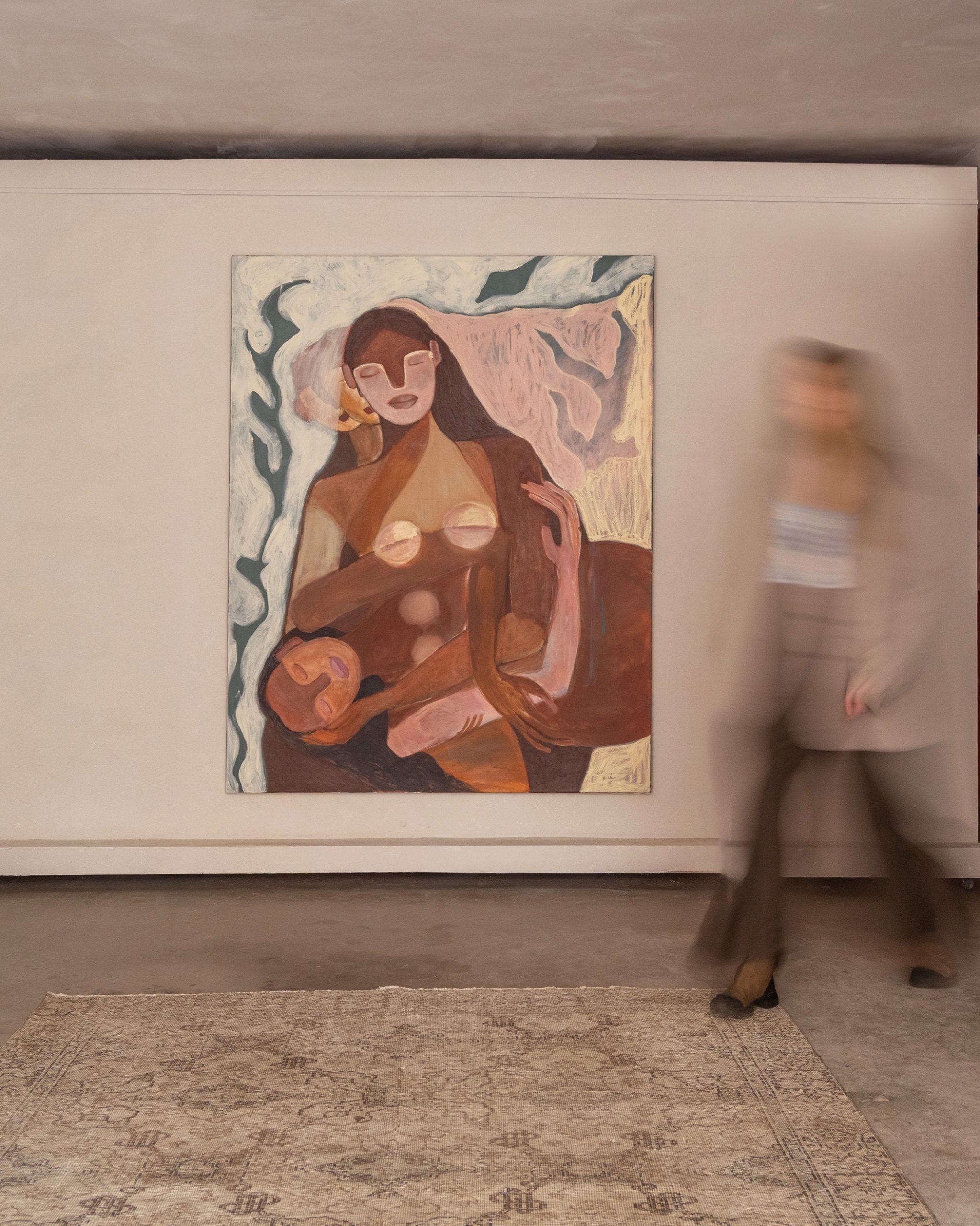 With a background in psychology and mathematical systems, and a period of artistic research at the Gerrit Rietveld Academie, Denters’ practice bridges structural awareness with emotional tracework. Her use of acrylic on linen reflects this balance – building images through layering, concealment, and return.