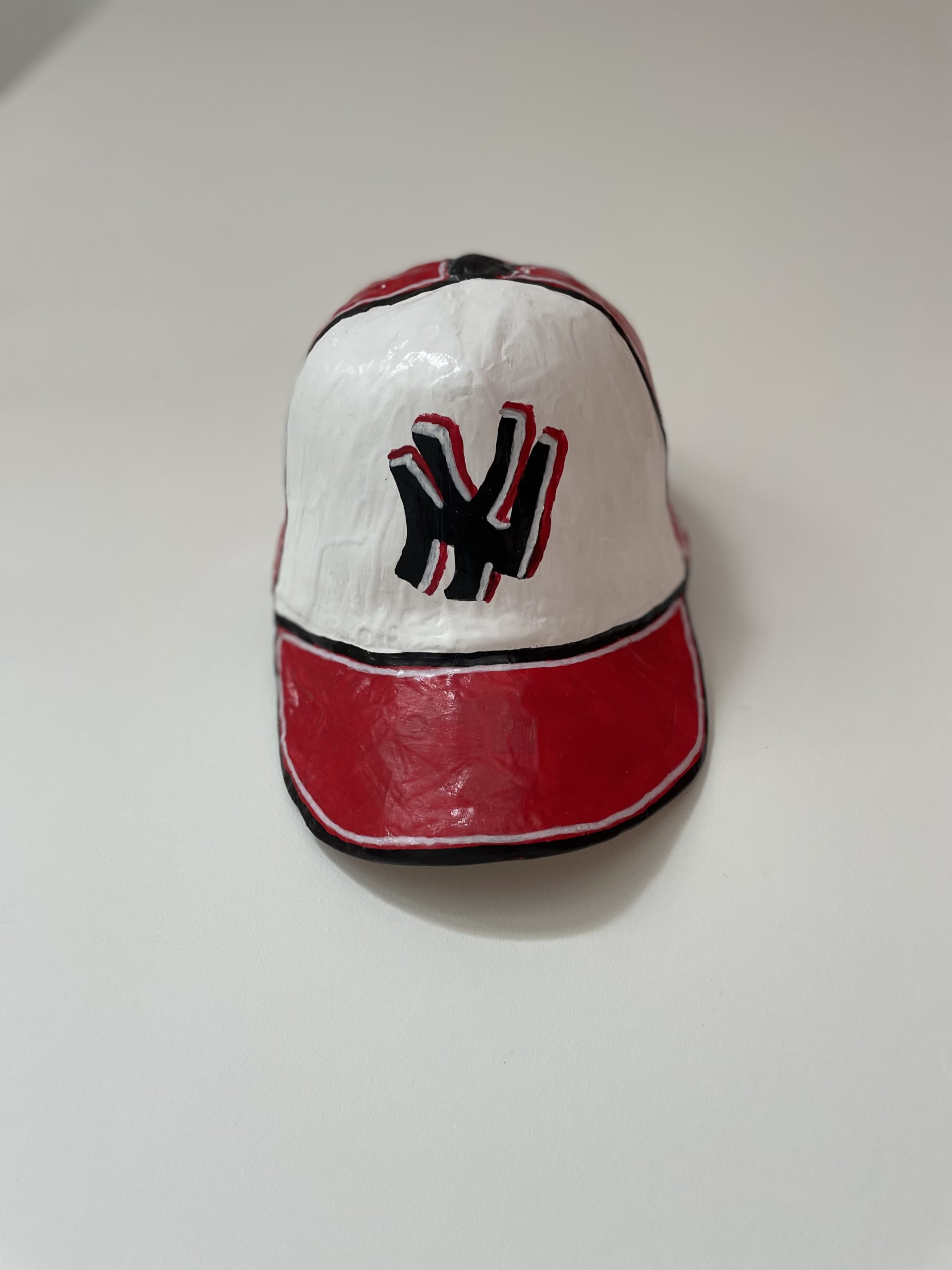 Olav van Lede explores the idea of how people use clothing and merchandise to express their identities—whether political, fashionable, or ideological. These choices are often made with great care. His series of painted ceramic hats reflects this theme of identification and belonging to a group. For some, it creates a sense of unity; for others, it highlights division and polarization.