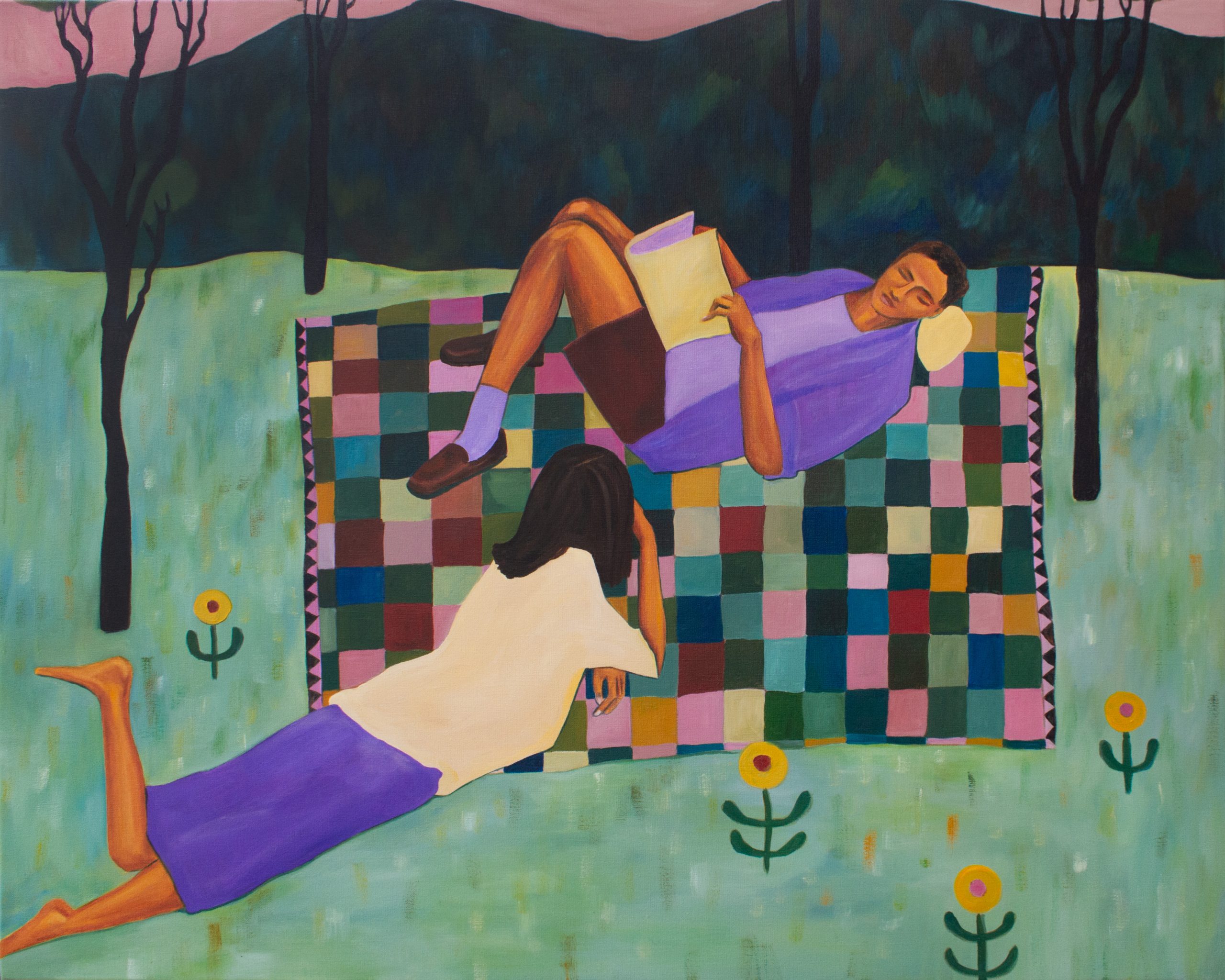 Renske Herder’s practice centers around vibrant, figurative paintings that celebrate moments of quiet connection, daily rituals, and a slow and peaceful way of living. Her compositions balance narrative and abstraction, with whimsical details like a flying bird or patterned quilt, evoking folk art traditions through a contemporary lens.