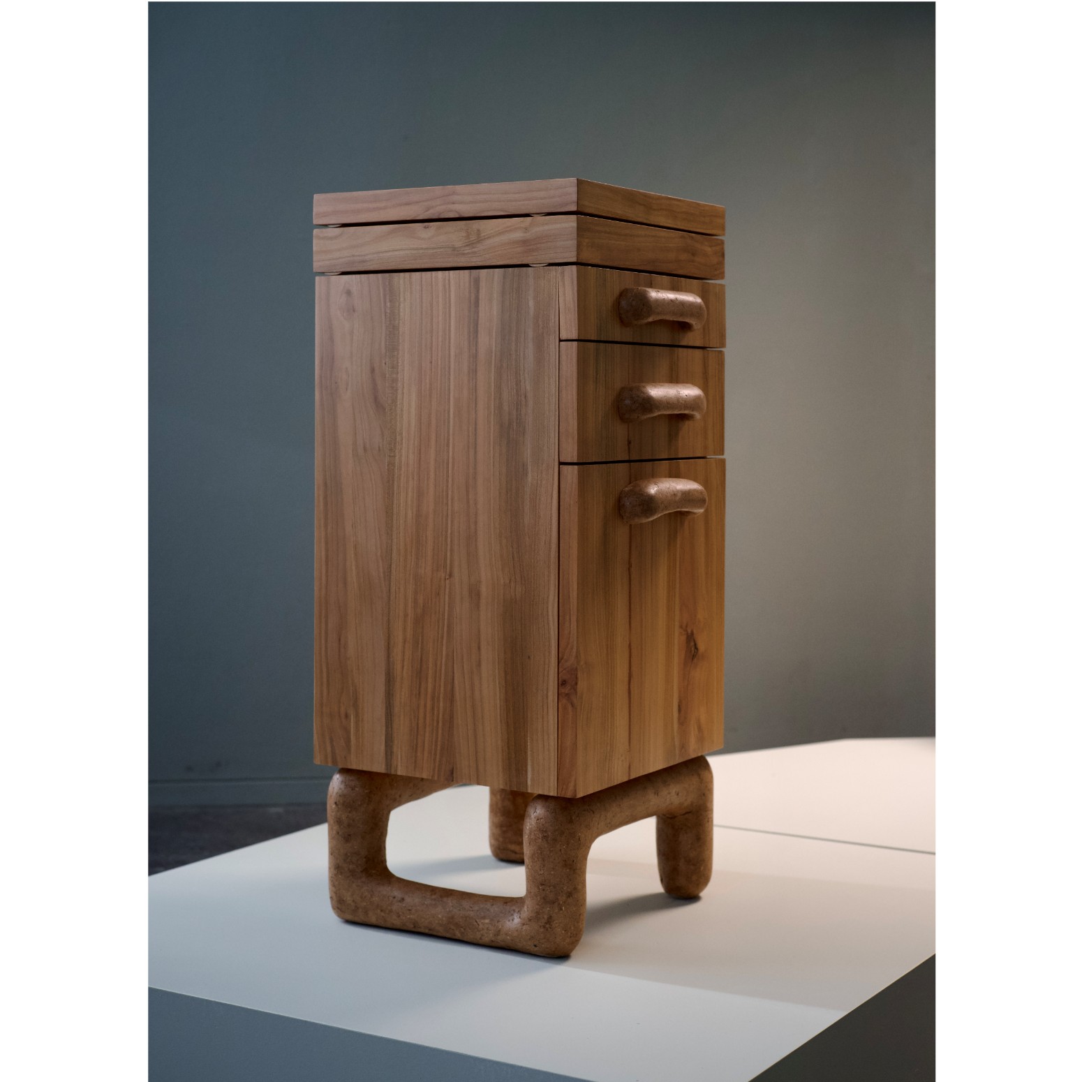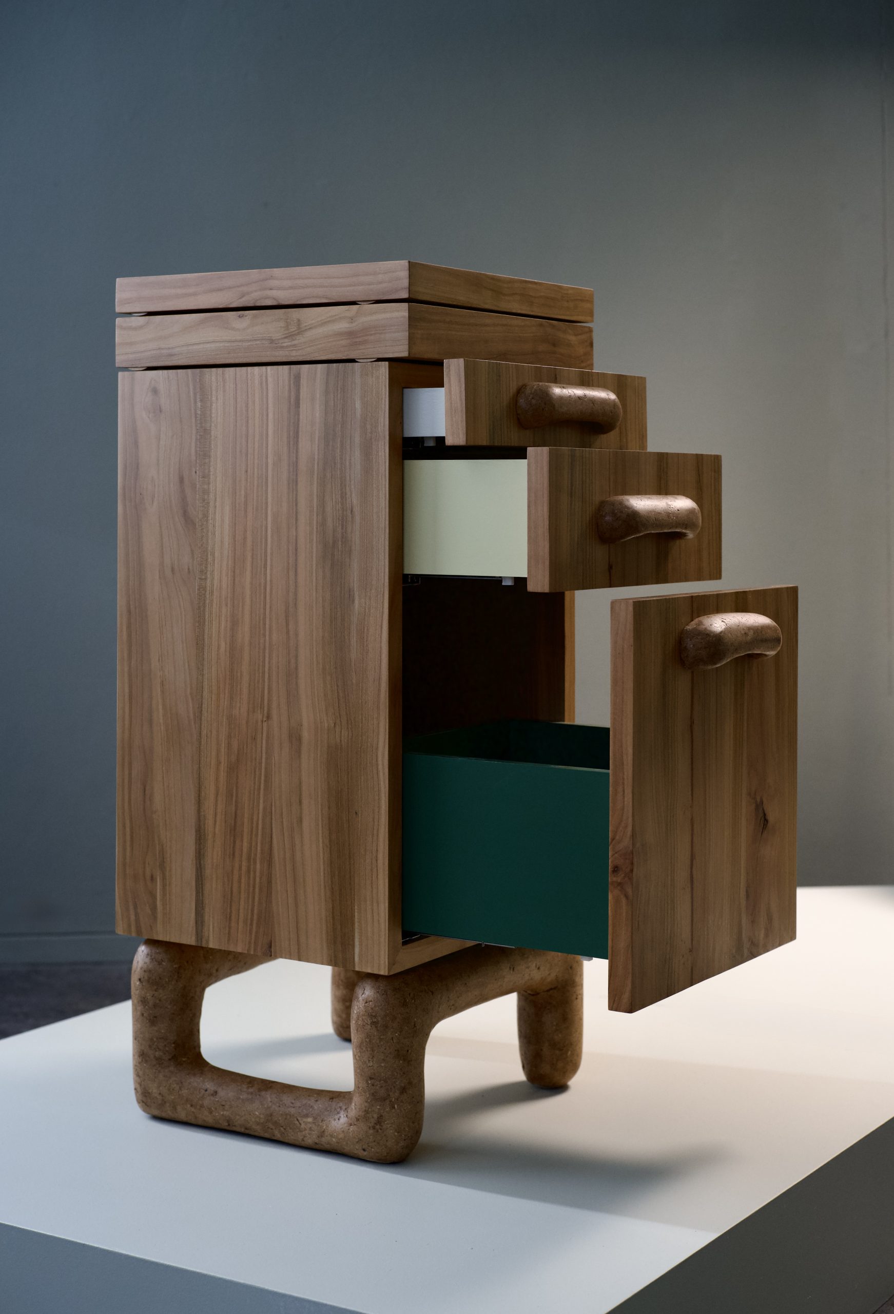His series Emulsify Discipline and Freedom blends sculpture, furniture, and nature. A cupboard, a lamp, and a desk-chair emerge from straight-cut wooden planks and a self-developed ‘wood clay’ made from recycled sawdust — materials that carry the scent, warmth, and tactility of the forest.